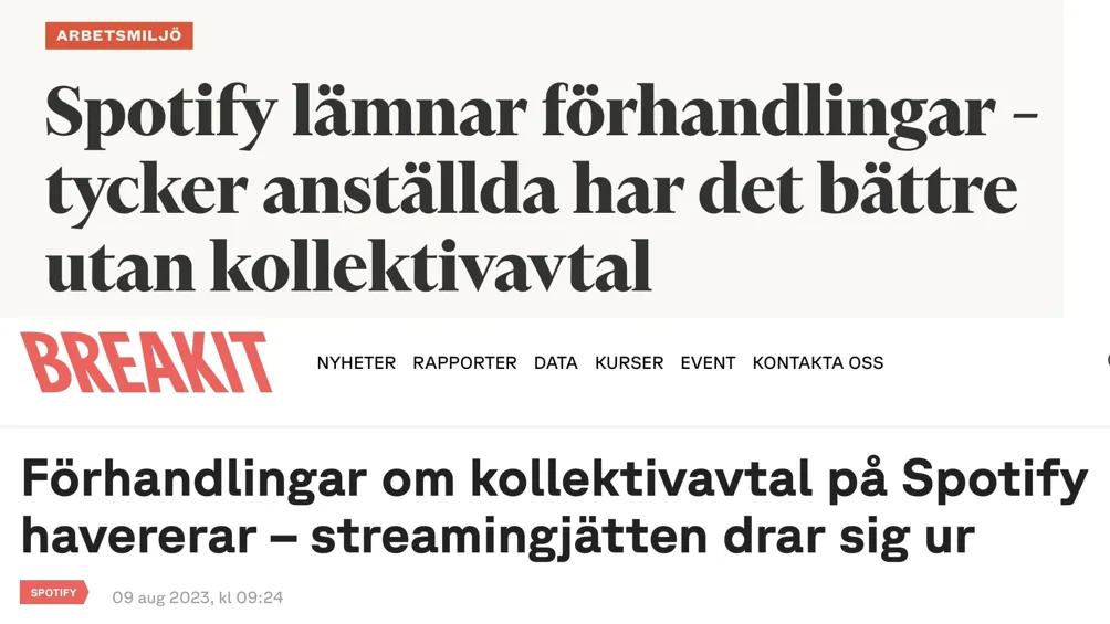 Förra Ă„ret förhandlade Spotify om kollektivavtal med flera stora fackförbund. Parterna lyckades dock inte komma överens. I samband med att Spotify drog sig ur förhandlingarna kommenterade en talesperson saken sĂ„ hĂ€r i ett mejl till SVT:s âKulturnyheternaâ: