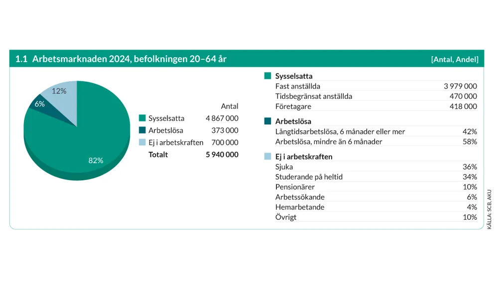 SysselsĂ€ttningen minskade och arbetslösheten ökade â en mycket kort sammanfattning av arbetsmarknaden 2024. Efter att 2023 ha haft den högsta sysselsĂ€ttningsgraden pĂ„ 2000-talet sĂ„ syns lĂ„gkonjunkturen i Sverige tydligt i siffrorna. Arbetskraften bestĂ„r av sysselsatta och arbetslösa men andelarna mĂ€ts pĂ„ olika sĂ€tt. SysselsĂ€ttningsgraden visar andelen av befolkningen som arbetar och arbetslösheten Ă€r andelen av arbetskraften som saknar arbete, bĂ„da Ă€r viktiga mĂ„tt för att visa utvecklingen pĂ„ arbetsmarknaden.