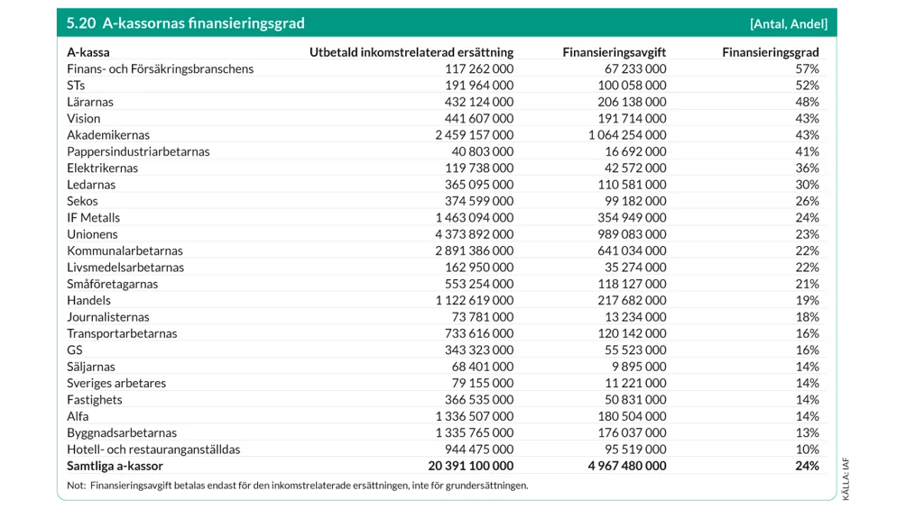 A-kassorna betalar varje mĂ„nad en sĂ„ kallad finansieringsavgift till staten för att tĂ€cka delar av statens kostnader för utbetald arbetslöshetsÂersĂ€ttning. Storleken pĂ„ finansieringsavgiften beror pĂ„ antalet medlemmar och den genomsnittliga dag penningen i a-kassan. Den Ă€r inte kopplad till hur hög eller lĂ„g arbetslösheten Ă€r. 2024 betalade a-kassorna in cirka 5 miljarder kronor i finansierings avgift till staten och totalt betalades 20,4 miljarder ut i inkomstrelaterad ersĂ€ttning till de arbetslösa. Det innebĂ€r att de medlemsavgifter som medlemmarna betalade till a-kassorna finansierade ungefĂ€r 24 procent av den utbetalade ersĂ€ttningen. Det skiljer stort mellan a-kassorna nĂ€r det gĂ€ller finansieringsgraden, de a-kassor som har högre arbetslöshet och dĂ€rmed högre utbetalningar betalar in betydligt mindre Ă€n vad de betalar ut. Finans och försĂ€kringsbranschens a-kassa hade högst finansierings grad med 57 procent och Hotell och restauranganstĂ€lldas lĂ€gst med 10 procent. Akademikernas a-kassa hade en finansieringsgrad pĂ„ 43 procent.