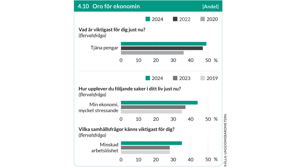 Ungdomsbarometern har i Generationsrapporten 2025 bland annat frĂ„gat ungdomarna (15â24 Ă„r) vad som Ă€r viktigt i livet. 49 procent av dem uppger att en av de viktigaste sakerna för dem Ă€r att tjĂ€na pengar, och siffran har ökat med hela 13 procentenheter pĂ„ fem Ă„r. Samtidigt upplever mĂ„nga, 44 procent, att deras ekonomi Ă€r mycket stressande. Och det Ă€r inte bara ett privatekonomiskt intresse bakom siffrorna, enligt Ungdomsbarometern Ă€r det ocksĂ„ en effekt av de rĂ„dande ekonomiska omstĂ€ndigheterna och att framtiden kĂ€nns oviss. Det visar ocksĂ„ frĂ„gan om vilka samhĂ€llsfrĂ„gor som kĂ€nns viktigast, dĂ€r Minskad arbetslöshet har ökat i betydelse â 35 procent tycker att det Ă€r en viktig frĂ„ga, vilket Ă€r en ökning med 7 procentenheter sedan 2019