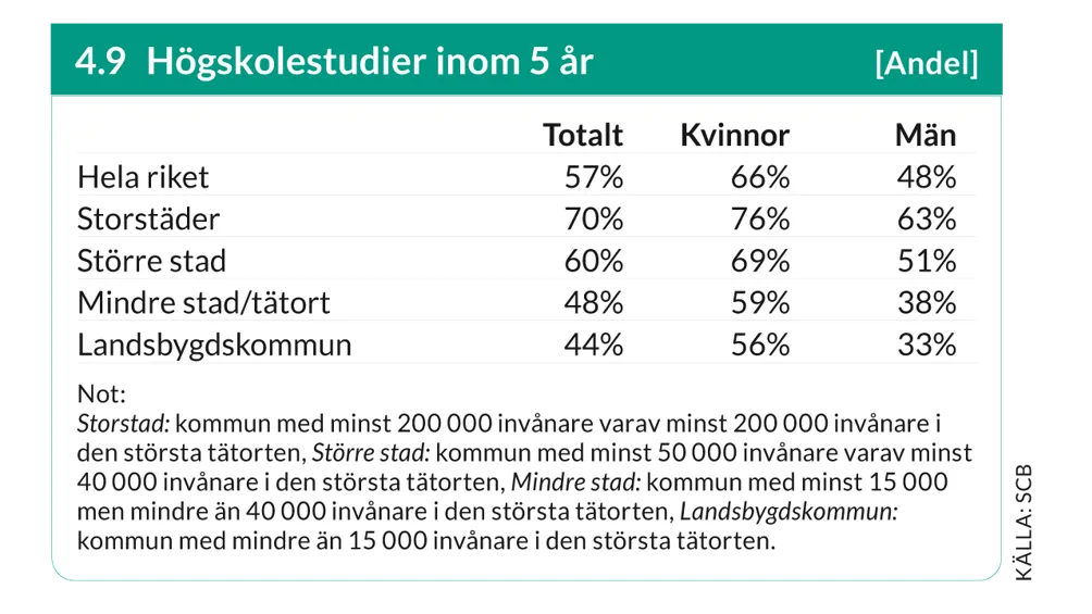 Av dem som gick ut gymnasiet 2019 var det 66 procent av kvinnorna och 48 procent av mÀnnen som lÀste vidare pÄ högskolan inom fem Är. Det Àr vanligare i storstÀderna Àn pÄ landsbygden att man studerar vidare och dÀr Àr ocksÄ minst skillnad mellan kvinnor och mÀn nÀr det gÀller hur stor andel som börjar pÄ högskola inom fem Är. I storstÀderna lÀste 76 procent av kvinnorna och 63 procent av mÀnnen vidare medan motsvarande siffra i landsbygdskommunerna var 56 och 33 procent. Oavsett region sÄ lÀser kvinnorna vidare i större utstrÀckning Àn mÀnnen.