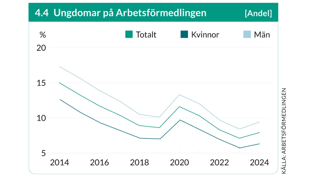 2023 var andelen inskrivna arbetslösa ungdomar (18â24 Ă„r) pĂ„ Arbetsförmedlingen den lĂ€gsta pĂ„ hela 2000-talet, men under 2024 ökade den nĂ„got. Arbetsförmedlingens bedömning Ă€r att ungdomsarbetslösheten kommer att öka Ă€ven under 2025 och att den dĂ€refter sjunker i takt med att efterfrĂ„gan pĂ„ arbetskraft vĂ€ntas öka. Demografin har betydelse för arbetslöshetsnivĂ„erna för ungdomar â ungdomskullarna har minskat sedan 2014 och dĂ„ har Ă€ven arbetslösheten minskat (förutom under pandemin). De nĂ€rmaste Ă„ren bedömer SCB att befolkningen i Ă„ldern 18â24 Ă„r kommer öka marginellt.