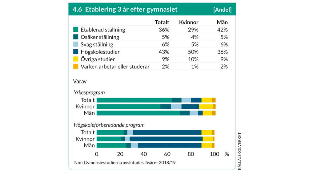 2018/19 var det 76 000 som tog examen frĂ„n gymnasiet. Tre Ă„r senare, 2022, hade 79 procent av dem antingen en etablerad stĂ€llning pĂ„ arbetsÂmarknaden eller sĂ„ studerade de pĂ„ hög skolan. Av dem som gĂ„tt ett yrkesprogram var det 64 procent som hade en etablerad stĂ€llning pĂ„ arbets marknaden medan det bland dem som hade gĂ„tt ett högskoleÂförberedande program var 23 procent â flera av dem valde att studera vidare.