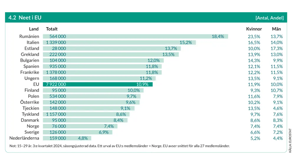 Tredje kvartalet 2024 var det 10,9 procent av EU:s unga (15â29 Ă„r) som varken arbetade eller studerade, vilket Ă€r i stort sett oförĂ€ndrat jĂ€mfört med 2023. Sverige ligger med 6,9 procent bland de lĂ€nder som har lĂ€gst andel. Högst andel hade RumĂ€nien med 18,4 procent vilket Ă€r nĂ€stan fyra gĂ„nger högre Ă€n NederlĂ€nderna som hade lĂ€gst med 4,8 procent. EU har som mĂ„l att NEET för personer i Ă„ldern 15â29 Ă„r ska sĂ€nkas till 9 procent 2030, och Sverige ligger redan en bra bit under det mĂ„let.