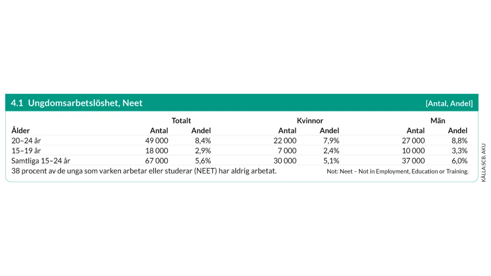 2024 var det i snitt 67 000, 5,6 procent, av befolkningen 15â24 Ă„r som varken arbetade eller studerade, sĂ„ kallade NEET (Not in Employment, Education or Training). Enligt SCB:s vanliga arbetskraftsundersökning var 166 000 (24,3 procent) unga arbetslösa men av dem var det 57 procent som var heltidsstuderande samtidigt som de sökte jobb. DĂ€rför kan det vara mer rĂ€ttvisande att istĂ€llet titta pĂ„ hur mĂ„nga som varken arbetar eller studerar. Ungdomar Ă€r en konjunkturkĂ€nslig grupp â nĂ€r konjunkturen viker sĂ„ Ă€r ungdomarna bland de första som drabbas men det positiva Ă€r att de ofta fĂ„r jobb snabbt nĂ€r vĂ€l konjunkturen vĂ€nder.
