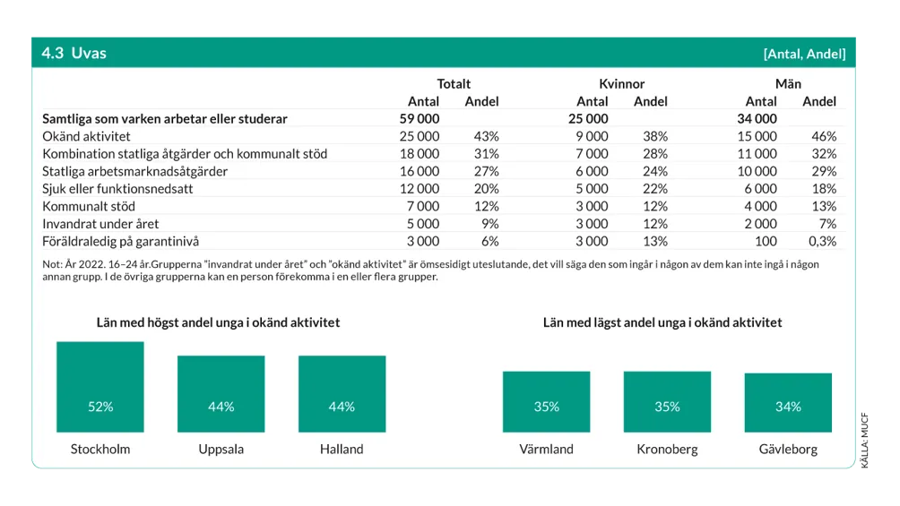 Uvas-mĂ„ttet ger möjlighet att se dessa ungdomars sysselsĂ€ttning under Ă„ret. De kan ha haft stöd frĂ„n Arbetsförmedlingen, sin kommun eller FörsĂ€kringskassan, eller flera aktörer samtidigt. En stor grupp, 43 procent, av 16â24-Ă„ringarna hade ingen kĂ€nd aktivitet, och mĂ€nnen i högre utstrĂ€ckning Ă€n kvinnorna, 46 respektive 38 procent. Skillnaderna i landet var stora. I Stockholms lĂ€n kunde hĂ€lften av de som varken arbetade eller studerade inte spĂ„ras i nĂ„gra register, medan det i GĂ€vleborg var drygt 3 av 10. Att unga mĂ€nniskor varken arbetar eller studerar kan förstĂ„s bero pĂ„ olika saker och pĂ„ olika grad av frivillighet. En del har helt enkelt frivilligt valt att göra nĂ„got annat, till exempel resa utomlands, medan andra helt ofrivilligt har hamnat utanför systemet.
