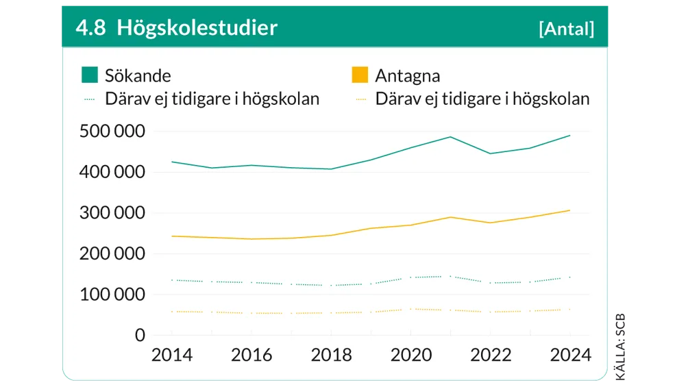 Efter en topp med sökande under pandemin gick efterfrÄgan pÄ högskoleutbildning ner igen. 2023 ökade den nÄgot och mellan höstterminerna 2023 och 2024 har antalet sökanden ökat med 7 procent till 490 000. Enligt Universitets och högskolerÄdet var det störst ökning av nya sökande, som inte sökt pÄ tio Är. Det indikerar att fler vill byta bana. LÄgkonjunkturen och det relativt nya omstÀllnings studiestödet som infördes 2022 Àr ocksÄ faktorer som bidrar till ökat intresse för att studera.