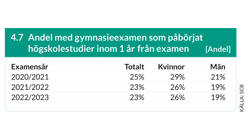 Av dem som tagit en gymnasieexamen Àr det ungefÀr var fjÀrde som börjar studera pÄ högskola inom ett Är. Under pandemin var det nÄgot högre andel som gick direkt till högskolan, men de senaste avgÄngsÄren har den varit oförÀndrat. Det Àr vanligare bland kvinnorna Àn bland mÀnnen att man vÀljer att studera sÄ nÀra inpÄ gymnasiet, 26 respektive 19 procent.