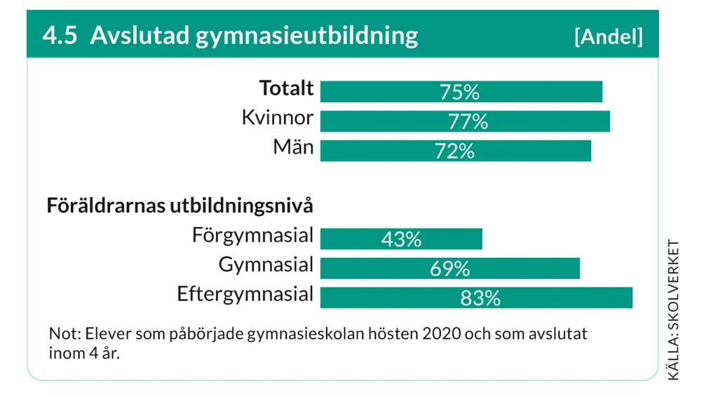 En fjĂ€rdedel av eleverna i en elevkull lĂ€mnar gymnasieskolan utan examen. Av de som började gymnasiet 2020 var det efter fyra Ă„r 75 procent som hade slutfört sin gymnasieutbildning och tagit examen. Vilken utbildningsnivĂ„ förĂ€ldrarna har spelar roll för om eleven avslutar sin utbildning eller inte â de elever vars förĂ€ldrar har en lĂ€ngre utbildning tar i högre grad examen. Av dem som hade förĂ€ldrar med eftergymnasial utbildning var det 83 procent som tog examen inom 4 Ă„r. Hade förĂ€ldrarna en gymnasial utbildning var det 69 procent av eleverna som tog examen och för elever vars förĂ€ldrar hade förgymnasial utbildning var det 43 procent. En avslutad gymnasieutbildning förbĂ€ttrar avseÂvĂ€rt möjligheterna att fĂ„ ett jobb och man brukar beskriva den som en vattendelare pĂ„ den svenska arbetsmarknaden. Av dem som Ă€r arbetslösa saknar 33 procent en gymnasieutbildning (se 3.8).